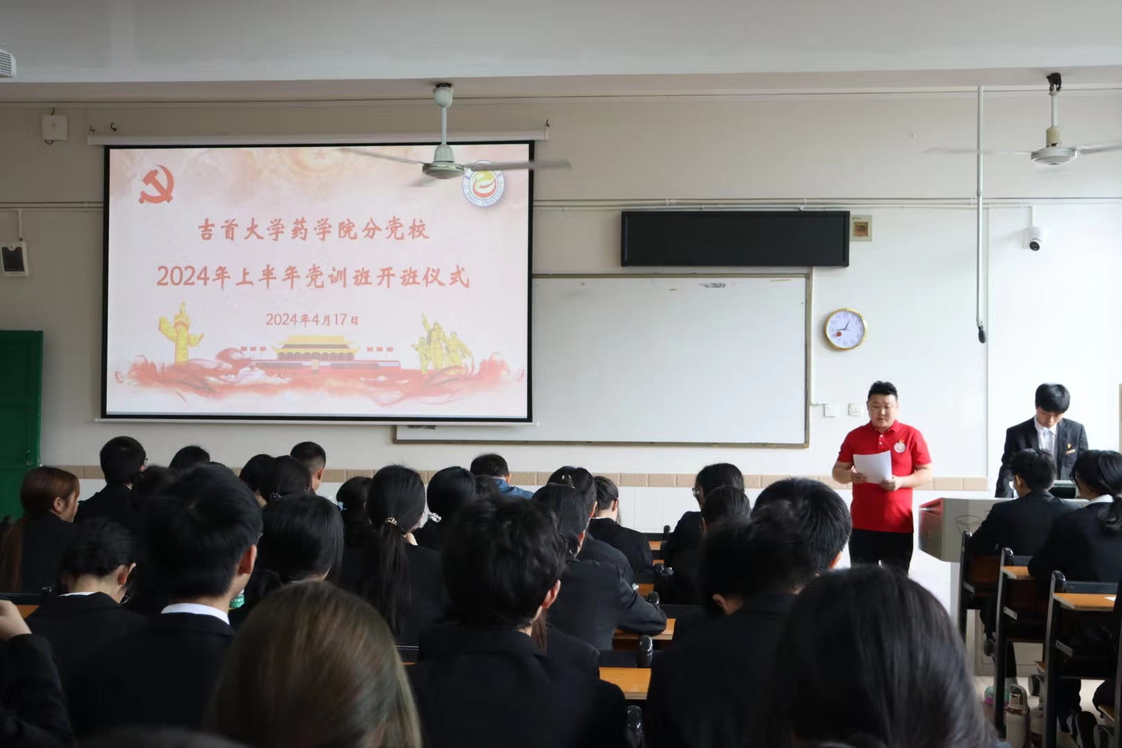 本网讯(通讯员 刘雨婷)2024年4月17日中午,公司2024年上半年党训班开班仪式在太阳成集团tyc234cc大田湾校区第一教学楼1301教室顺利举行,药公司党委副书记张勇华、党建组织员戴军、员工第一党支部书记向晓媚以及参加本次党训班的入党积极分子、党员发展对象、预备党员参加仪式。仪式由员工第二党支部书记鲁明新主持。