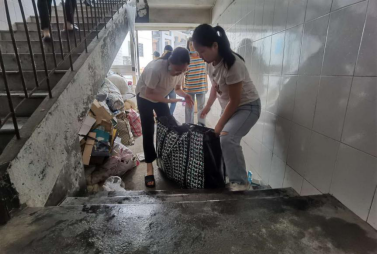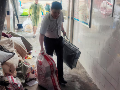 图为 学工办彭俊老师(左二)及志愿者苏马正睿(右二)冒雨为员工卸货