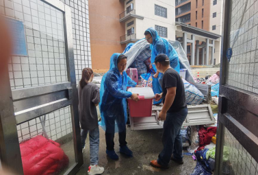 清晨8点,随着第一趟专用车从砂子坳校区出发,公司搬迁之战正式打响。上午8:36,第一趟专用车到达大田湾校区女生6栋宿舍楼下,此时还下着大雨,又正值疫情防控特殊时期,考虑到员工雨太大,女生力气太小,王江生老师带领学工办彭俊老师、石静咏诗老师及志愿者苏马正睿冒雨为员工卸货,组织同学们有序搬运,在场员工也积极投入到搬迁工作中。