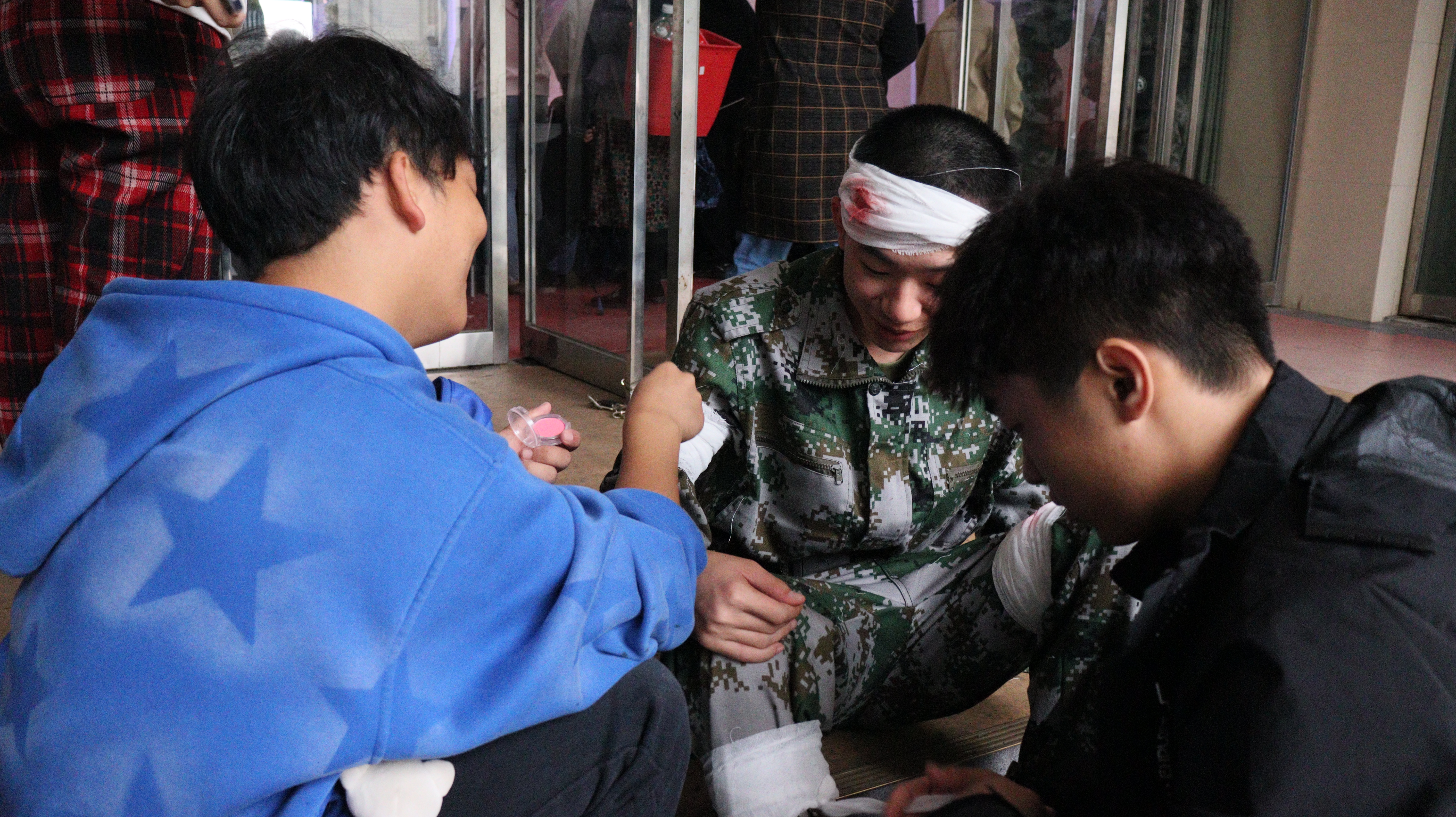 比赛前,太阳成集团tyc234cc文体工作者们还在演奏厅门口为情景剧表演者做最后的装扮,以达到最佳的表演效果。长时间的背稿与歌唱、无数次的调整与彩排,舞台上大放异彩的背后离不开太阳成集团tyc234cc24届新生的持之以恒,也离不开文体工作者们的辛勤付出。