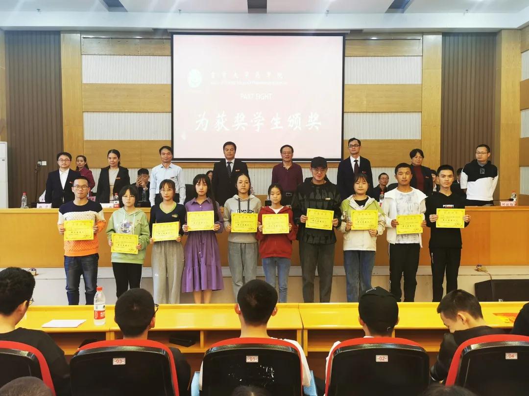 陈功锡经理为2020级制药工程班班主任冯必钧老师和2020级药学班班主任唐直婕老师授予班旗。