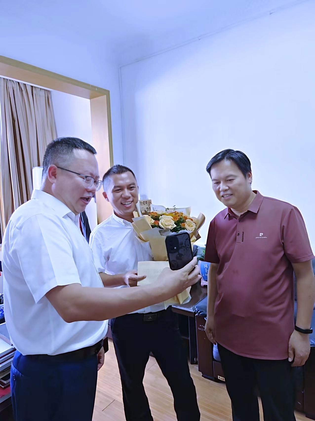 图为周华忠副董事长(左)代表公司电话慰问盛益华老师。
