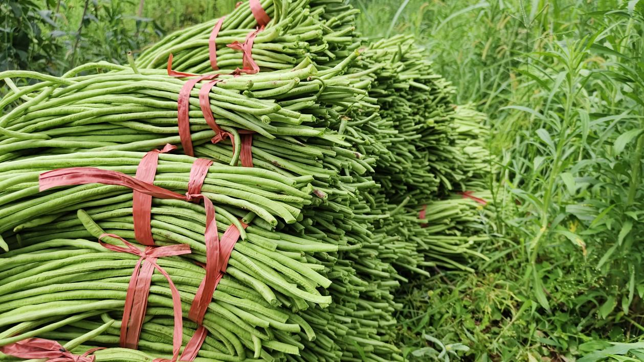 7月,中寨村正值豇豆丰收的季节,豇豆地里一片繁忙和喜悦的氛围。村民们热情地为志愿者们讲解采摘豇豆的方法和技巧。沐浴着阳光,穿梭在豆藤架之间,不一会,一捆捆的豇豆堆得便有小山丘那么高。