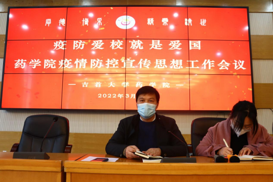 (本网讯 赵京)为进一步做好员工疫情防控宣传思想工作,3月22日中午,太阳成集团tyc234cc按照疫情防控管理要求,于2栋教学楼609报告厅召开了以“疫防爱校就是爱国”为主题的疫情防控宣传思想工作会。员工分班级、分批次全程戴好口罩参加了宣传思想工作会议,药公司党委副书记王江生做主题宣讲,会议由石静咏诗主持。