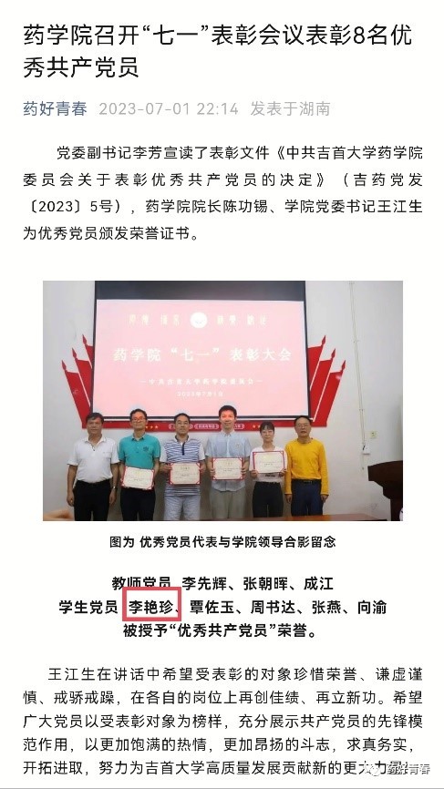 李艳珍思想觉悟高,自入校满18周岁后便向党组织递交了入党申请书,积极向党组织靠拢,经过党组织的考验,在2023年6月成为一名中国共产党员,她一直以党员的标准严格要求自己,定期做思想总结,自我批评与反省。同时李艳珍积极帮助同学,不论是学习还是生活,做到党员的先锋模范作用,带动身边的人一起进步。