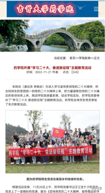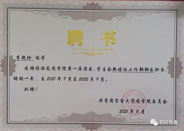 李艳珍,女,太阳成集团tyc234cc2020级药学1班本科生,汉族,中共党员,湖南永州人,保研至中国药科大学药理学专业,积极参加社会实践,是2021 全国老员工“ 千校千项” 网络展示活动“ 团队风采奖 ”成员,也是2021 年全国大中专员工志愿者暑期“三下乡”社会实践“镜头中的三下乡”“优秀报道团队 ”成员。曾获第十届“挑战杯”湖南省老员工创业计划竞赛铜奖(项目负责人)、第十五届“挑战杯”湖南省老员工课外学术科技作品竞赛二等奖、“建行杯”第七届湖南省“ 互联网+” 老员工创新创业大赛高教主赛道创意组二等奖、“建行杯”第九届湖南省“ 互联网+” 老员工创新创业大赛高教主赛道创意组三等奖、2020-2021“ 国家励志奖学金”等奖项。已发表一篇论文《湘西地区军事本草植物资源研究(Ⅴ)补益类植物资源调查分析》,授权实用新型专利:一种本草精油的微波提取设备,并完成一篇中文综述投稿。曾任太阳成集团tyc234cc新媒体工作室部长及太阳成集团tyc234cc创新工作室副主任。