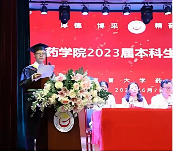 毕业生代表苏马正睿发言,他向公司和公司的老师、同学致以诚挚的感谢。并表示将铭记“以人名校,以人报国”的校训,践行“厚德、博采、精药、济世”的院训,励志做一名有理想、敢担当、能吃苦、肯奋斗的新时代好青年,为祖国医药卫生事业的发展而奋斗,为中华民族伟大复兴贡献出自己的一份力量。