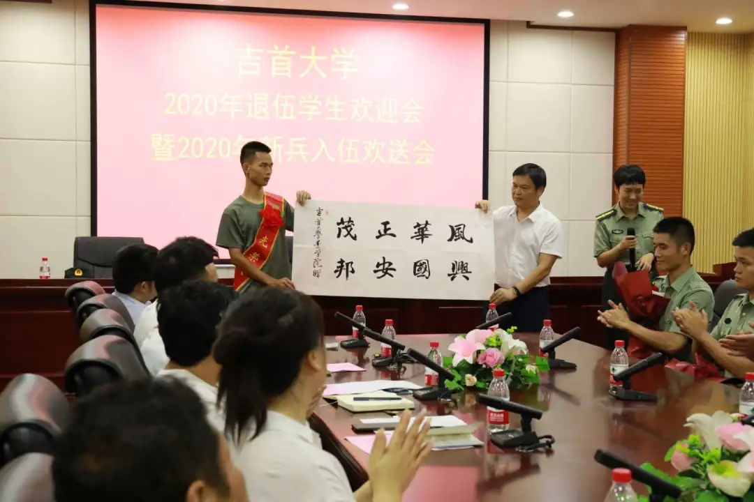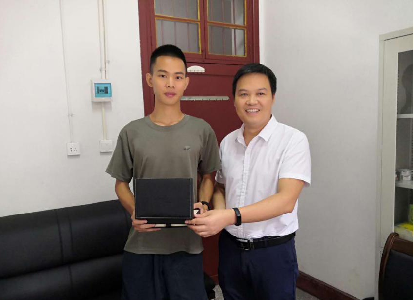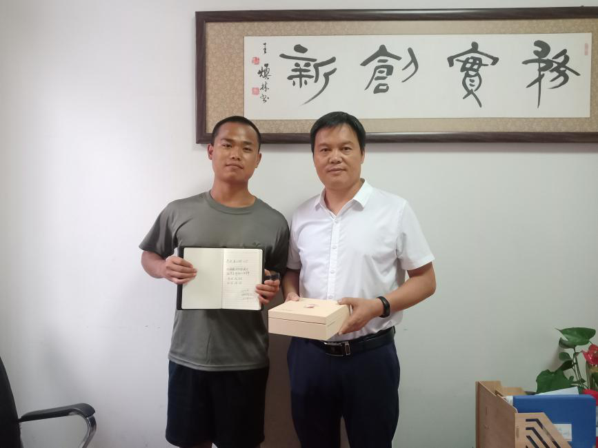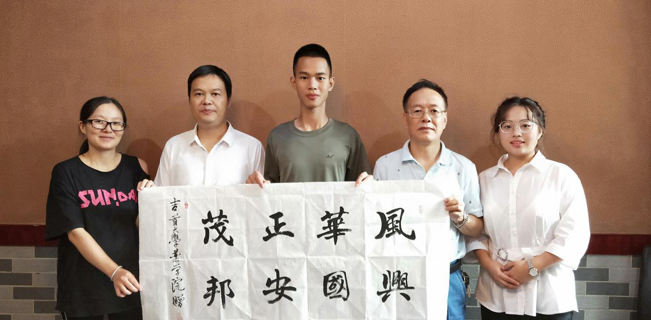 院领导陈功锡、王江生老师对入伍员工表示祝贺,在赠送的笔记本上写下寄语“把爱国心变成报国行,把青春梦融入强军梦,淬炼成钢,书写绚烂”。嘱咐他们“军队是一所大学,也是一座熔炉,要把自己当成一块钢,历经千锤百炼!”。随后,王江生老师将公司准备的笔记本、钢笔、书法作品(辅导员石静咏诗手书)赠送给两名员工。