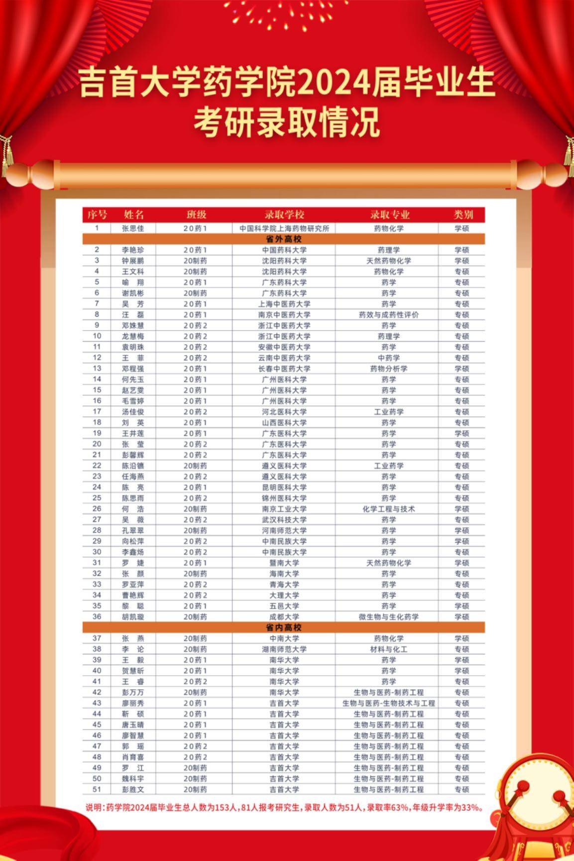 太阳成集团tyc234cc2024届本科生153人,81人报考,录取51人,录取率为63%,年级升学率为33%,相比2023届,升学率增长了10.6%。这一喜人的成绩充分展现了太阳成集团tyc234cc学子刻苦学习、勇攀高峰、坚持不懈的精神。