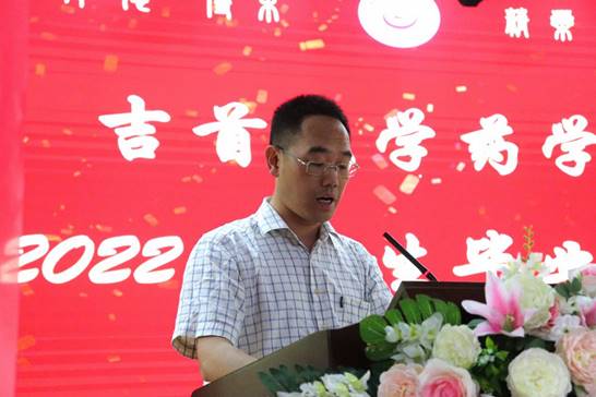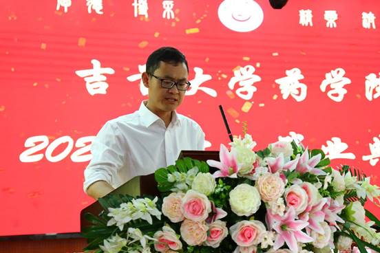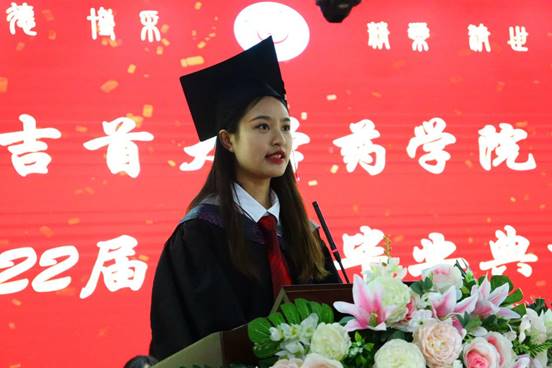 朱文俊(推免中南大学研究生)作为毕业生代表发言,回顾了四年学习的点点滴滴,深切表达了对母校、老师的感激之情和对同学、朋友的不舍之情。表示会谨记和践行“以人名校,以业报国”的校训和“厚德 博采 精药 济世”的院训,与时代共脉搏,在新的工作岗位上建功立业。