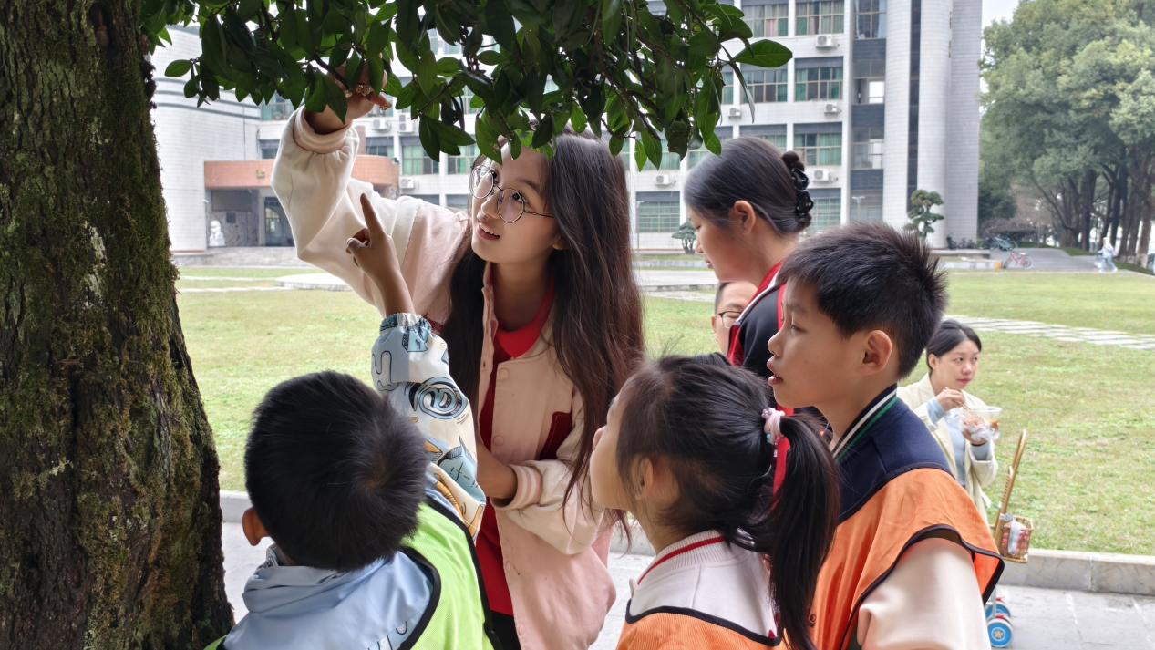 图为 志愿者为小朋友介绍乌柿