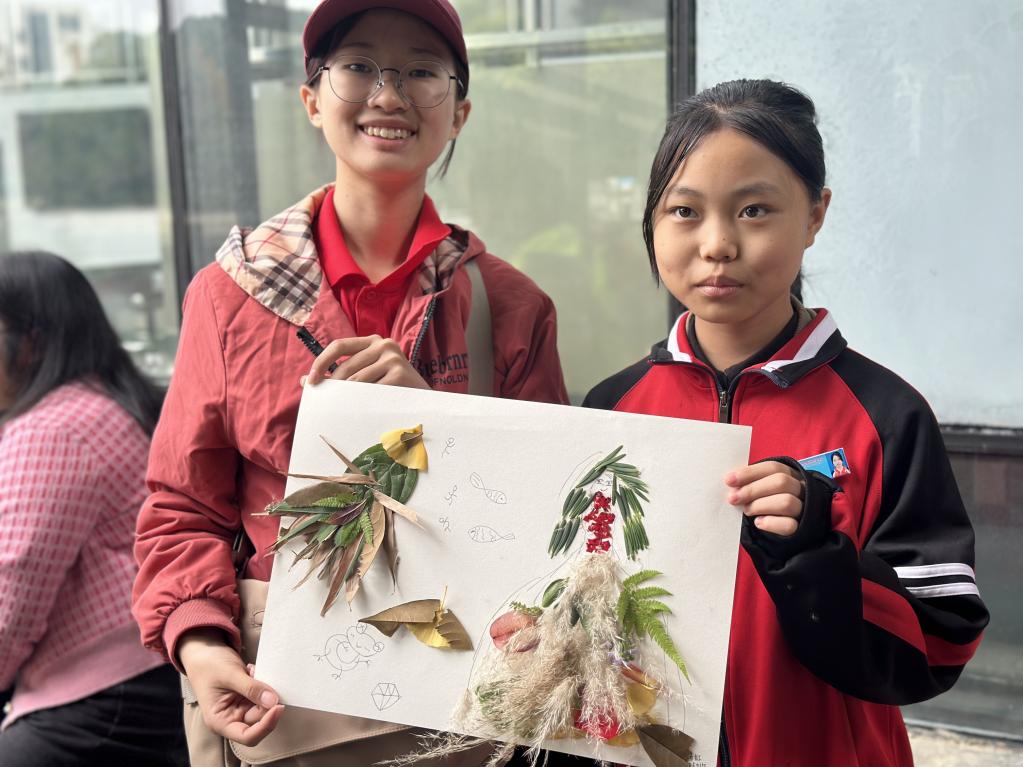 图为 志愿者与小朋友做树叶画