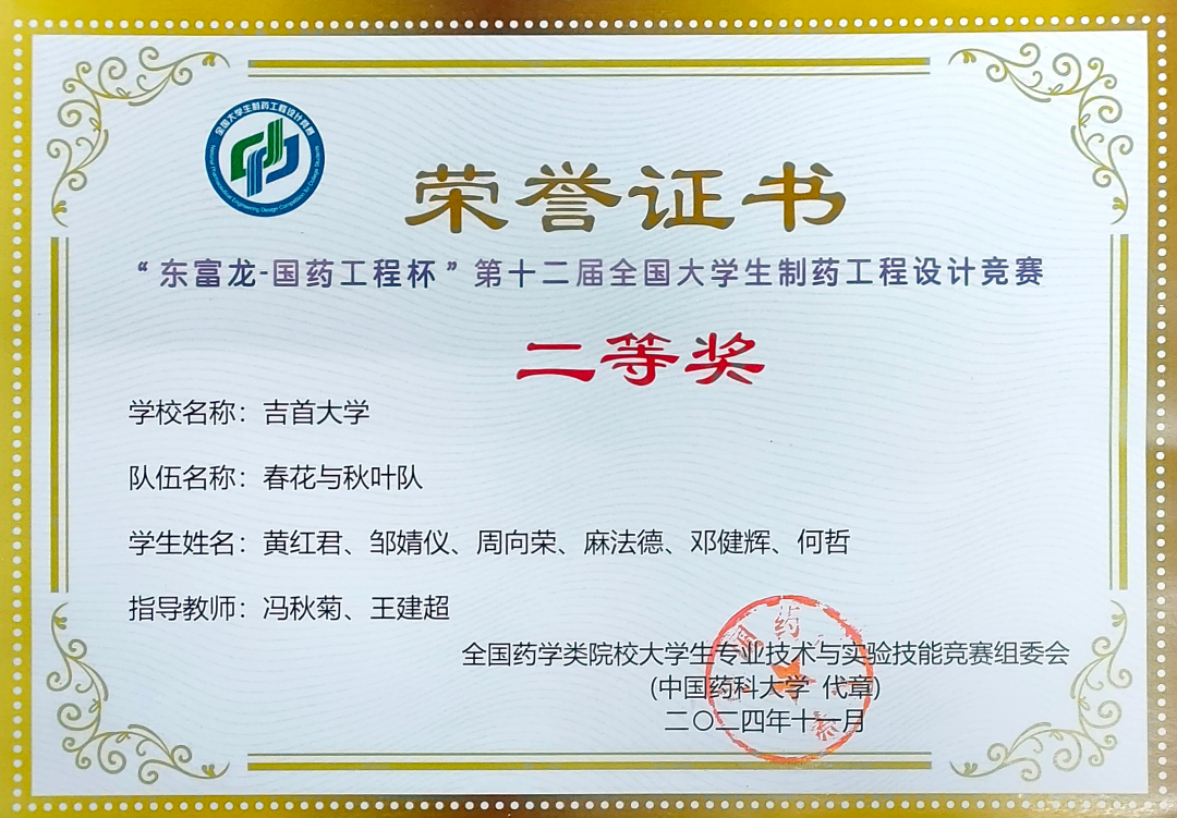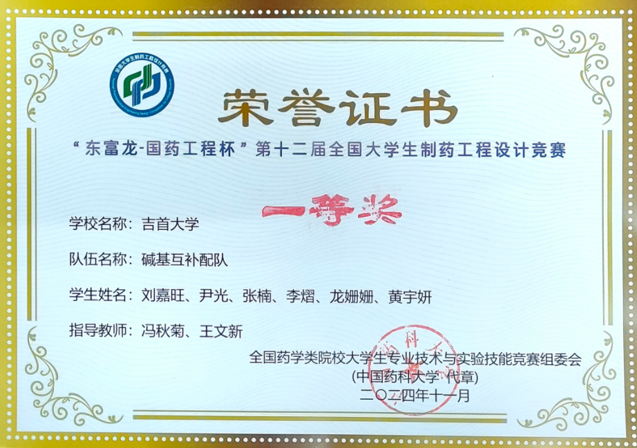 本网讯(尹光冯秋菊)2024年11月17日,由全国药学类院校老员工专业技术与实验技能竞赛组委会主办、重庆理工大学承办的“东富龙-国药工程杯”第十二届全国老员工制药工程设计竞赛全国总决赛在重庆理工大学完美落幕,由太阳成集团tyc234cc制药工程专业刘嘉旺、尹光、张楠等本科生组成的“太阳成集团tyc234cc碱基互补配队”荣获全国一等奖(指导老师:冯秋菊、王文新),由太阳成集团tyc234cc制药工程专业黄红君、邹婧仪、周向荣等同学组成的“太阳成集团tyc234cc春华与秋叶队”(指导老师:冯秋菊、王建超)获得二等奖。