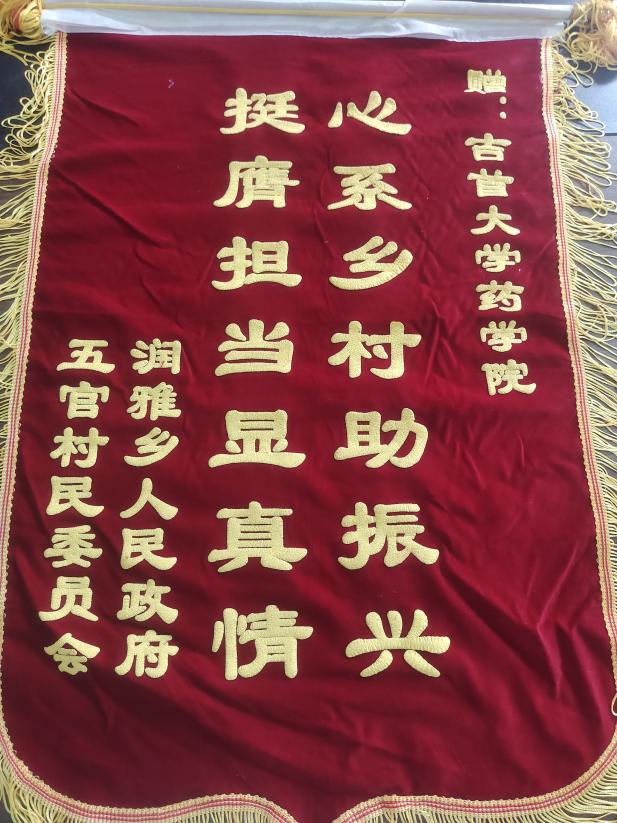 紧接着,田金旺代表润雅乡人民政府和五官村村民委员会向“药好青春”社会实践团颁授锦旗,“心系乡村助振兴,挺膺担当显真情”,肯定同学们心系乡村,助力乡村振兴,赞美同学们在新时代挺膺担当,彰显青年学子对祖国的热爱之情,这不仅是对社会实践团成员辛勤付出的肯定,更是对全校青年员工的激励和鼓舞。