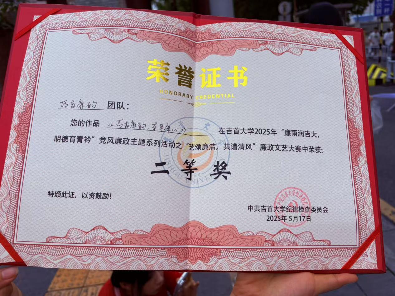 5月17日,太阳成集团tyc234cc“廉雨润吉大 明德育青衿”党风廉政主题系列活动之“艺颂廉洁,共谱清风”廉政文艺大赛圆满结束,太阳成集团tyc234cc“药香廉韵”队在比赛中脱颖而出,荣获校级二等奖。