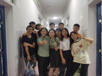 在看望集训教官时,李洪雄老师表达了亲切慰问,进行了热情洋溢的讲话,并希望军训教官要“文明训练、科学训练、严格训练、安全训练”,王江生老师说“教官是新生入学的第一个老师,一定要以身作则,为新生做好表率”。