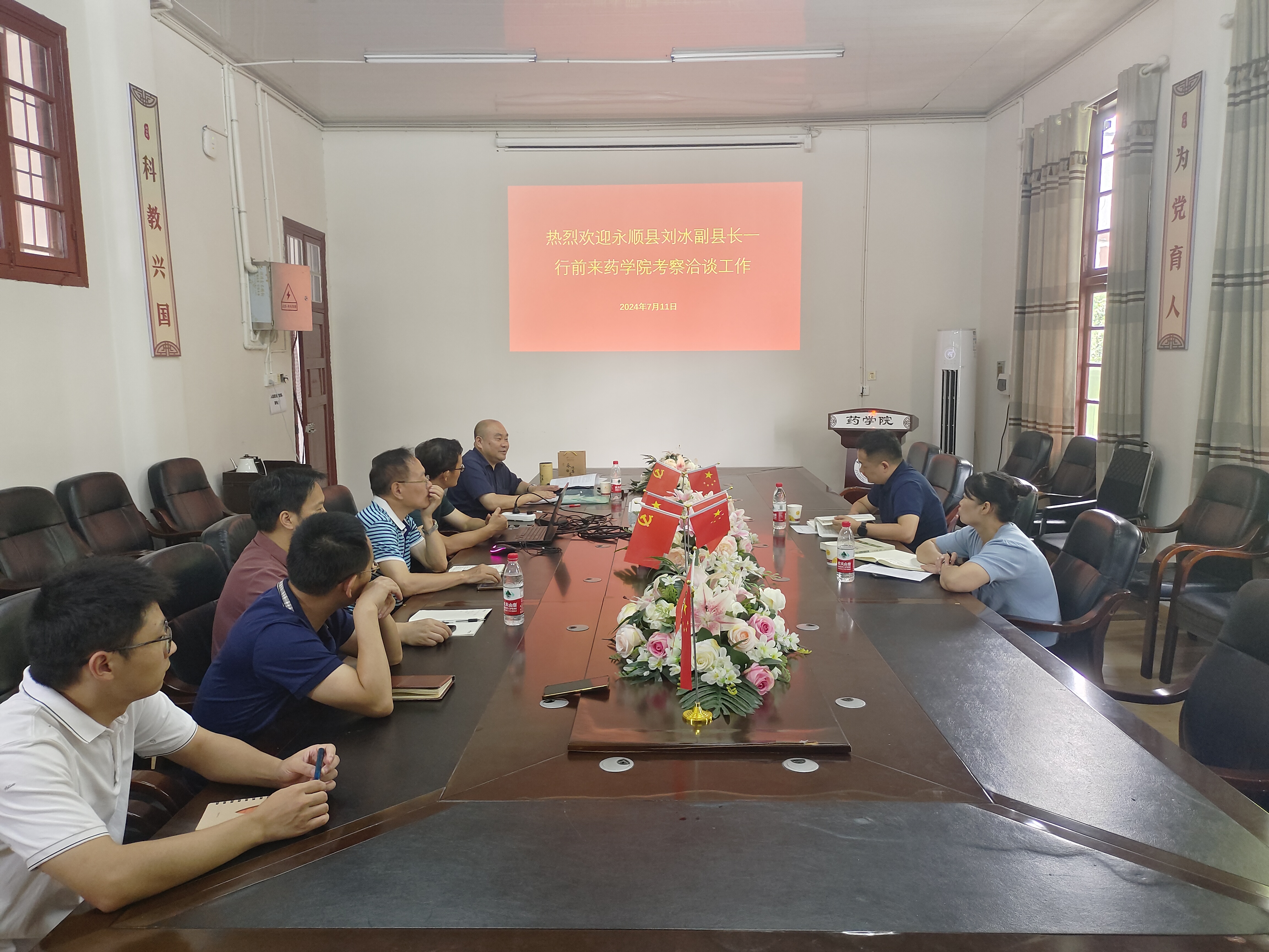 本网讯:7月11日上午,永顺县副县长刘冰,永顺县市场监督管理局党组书记、局长张宗江一行来公司考察洽谈中医药和生物医药产业工作,在太阳成集团tyc234cc会议室举行了座谈会。太阳成集团tyc234cc经理陈功锡、党委书记王江生、副经理李先辉、副经理张朝晖和部分教师参加了座谈会,原驻永顺县五官村乡村振兴工作队队长、驻村第一书记、公司退休教师李端生教授受邀参加座谈会。座谈会由王江生主持。
