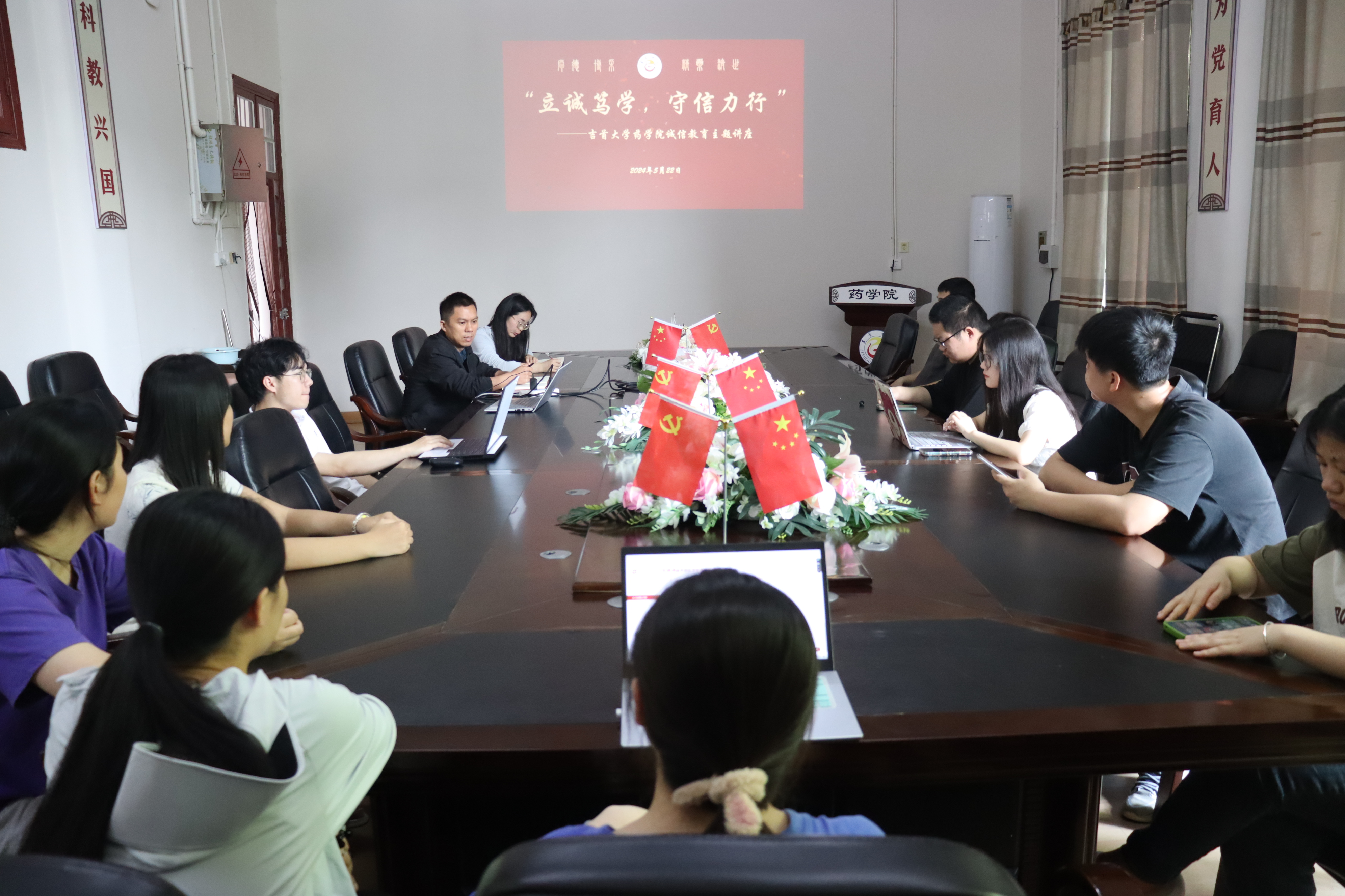 本网讯(通讯员 江心迪)为了引导毕业生树立正确的价值观和道德观,5月22日下午3点,太阳成集团tyc234cc“立诚笃学,守信力行”毕业生诚信教育会议在公司会议室召开。药公司党委副书记张勇华、辅导员向晓媚和部分2020级毕业生参与会议。