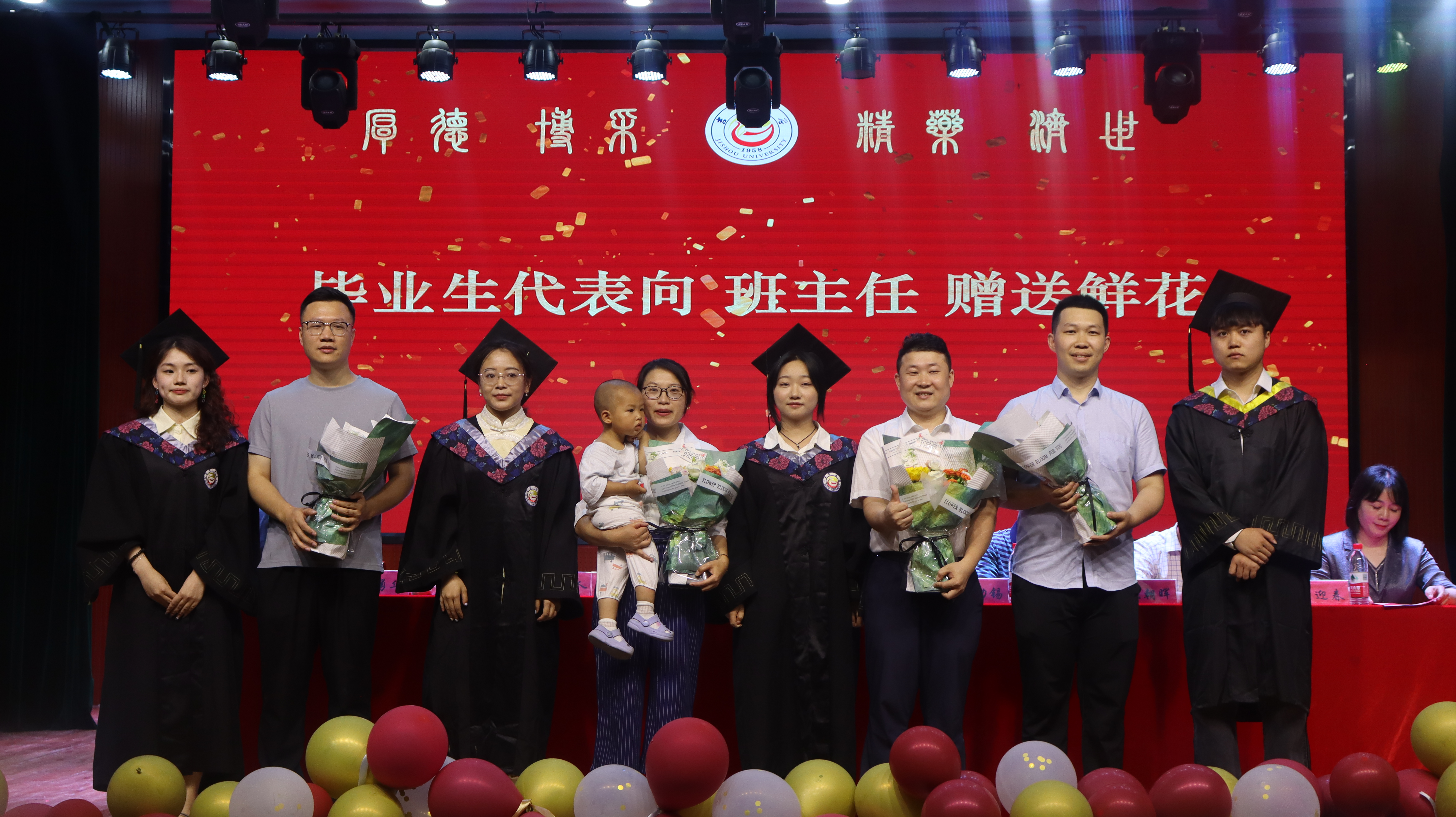 图为 毕业生代表向班主任赠送鲜花