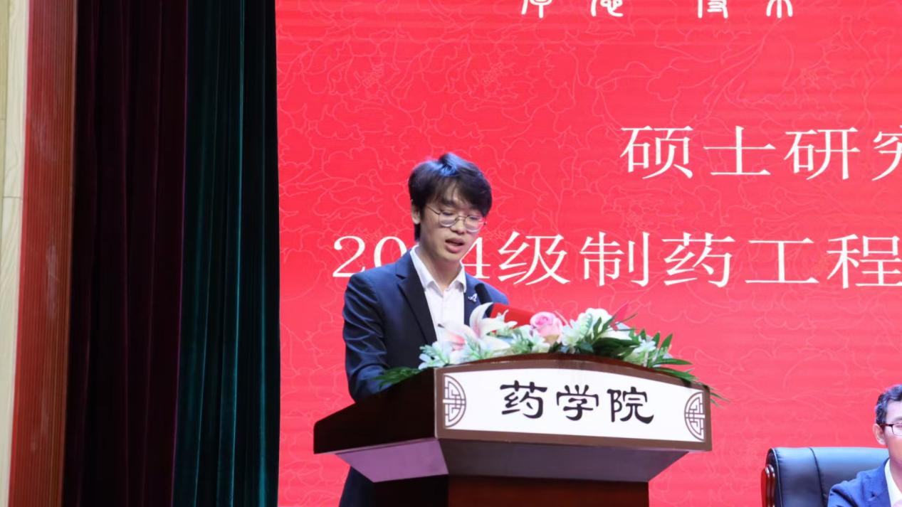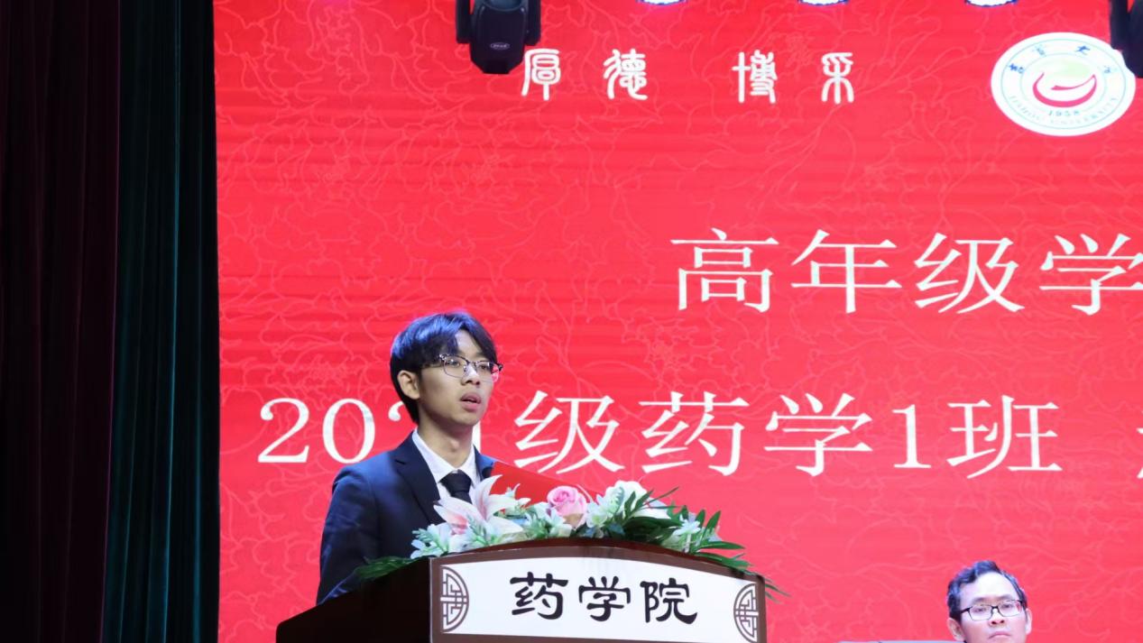 2021级药学1班赵京同学(推免至中国药科大学读研究生)作为老生代表分享介绍了自身经历、经验与成果。他鼓励新生牢记院训、校训和吉大精神,在新征程中积极进取,为公司和国家发展贡献力量。