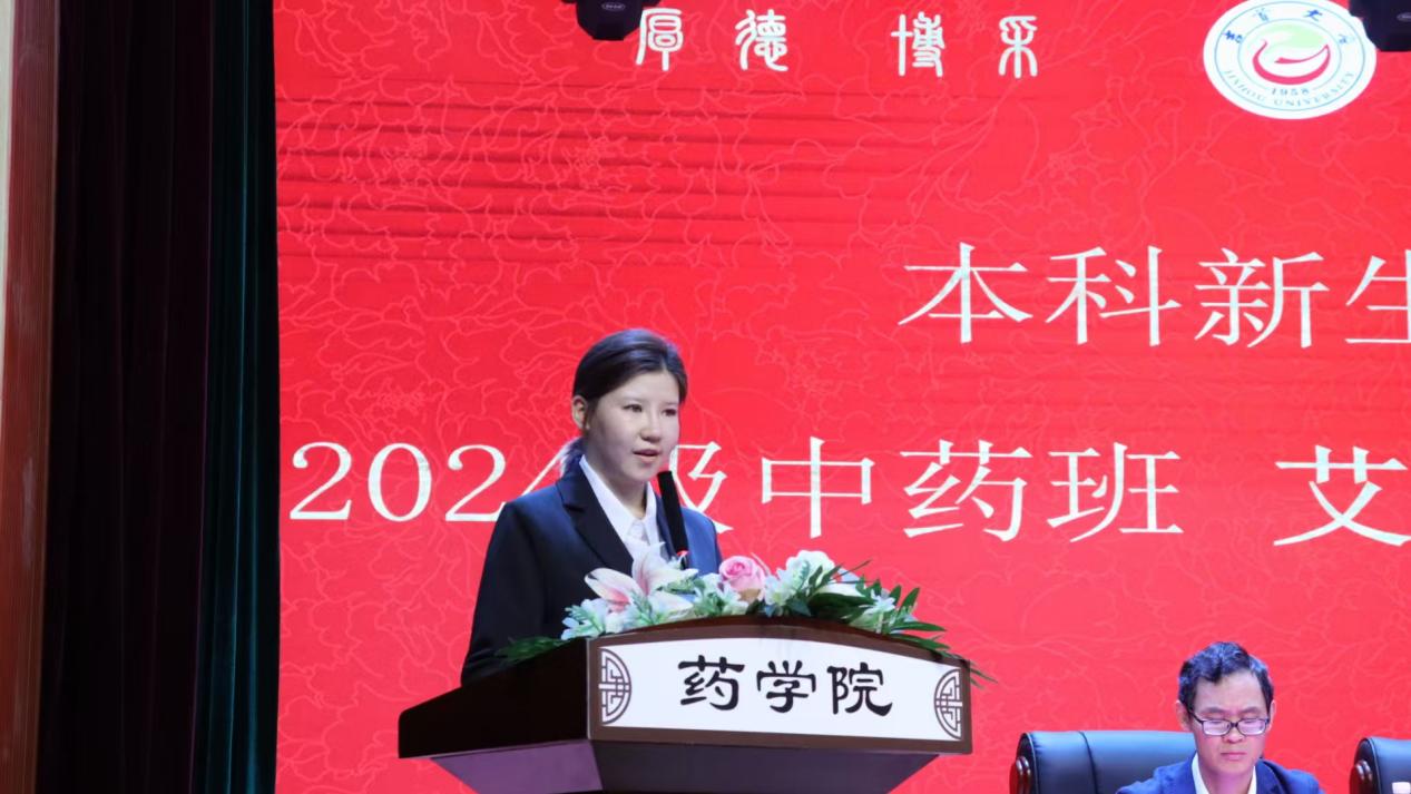 2024级中药学班艾琳娜作为本科生新生代表发言,表达了对学习新知识、实验室中探索未知等方面的憧憬。