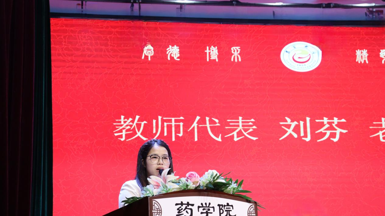 刘芬博士作为教师代表在开学典礼上发言,并分享了三点感悟:一是志存高远,以屠呦呦为榜样,将个人理想与国家医药事业相连,树立长远目标。二是珍惜当下,包括珍惜每节课、每次实验、每个机会、同学之间的情谊,脚踏实地前行。三是勇于挑战,她以屠呦呦研究青蒿素为例,说明药物研发的过程充满曲折,要把失败当作成长契机,锻造坚韧意志。最后期望同学们珍惜大学时光,成为优秀药学人。