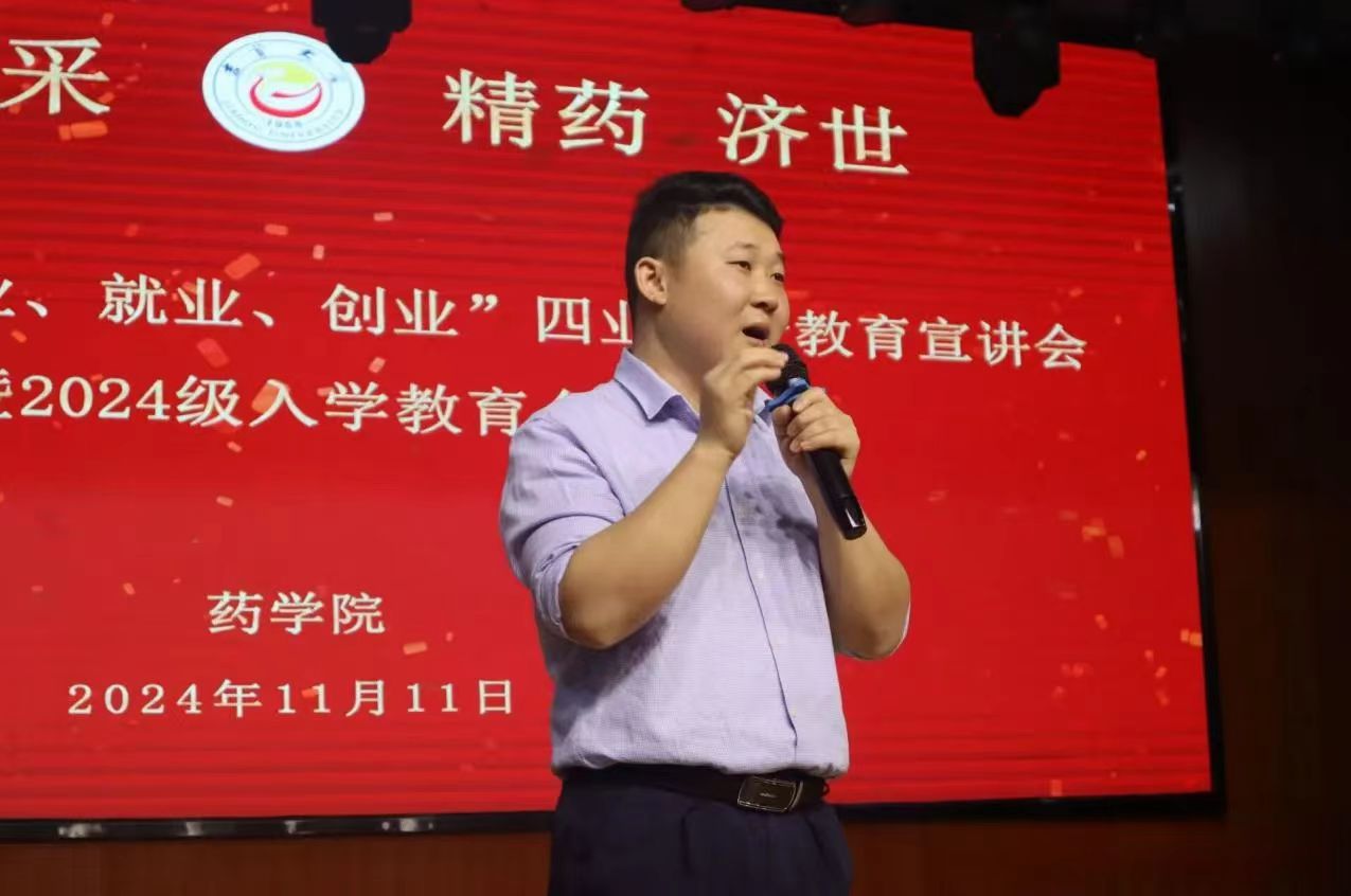 本网讯(通讯员江心迪、杨金鑫、刘雪莹)11月11日晚上,太阳成集团tyc234cc举行“专业、行业、就业、创业”四业融合教育宣讲会暨2024级员工入学教育会在大田湾校区大礼堂顺利举行。长沙晶易医药科技股份有限公司、湖南华纳大药厂股份有限公司、湖南洞庭药业股份有限公司、湖南恒兴医药科技有限公司、浙江海翔药业股份有限公司和齐鲁制药集团有限公司的招聘负责人进行宣讲,太阳成集团tyc234cc辅导员鲁明新出席本次会议,太阳成集团tyc234cc2021至2024级员工共370余人参加会议。会议由罗佩钰主持。